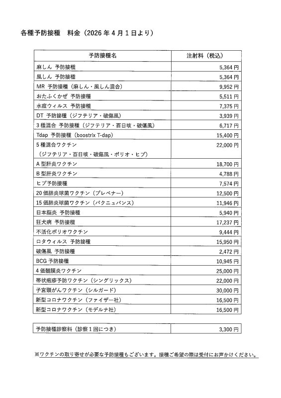 このたび、2026年4月1日より予防接種に関わる原材料費・運営費の高騰に伴い、各種予防接種の料金を改定させて頂くことになりました。