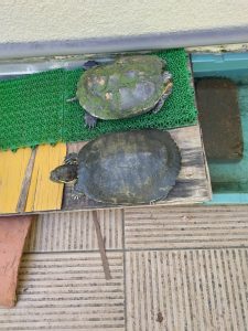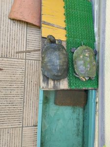 中庭では、珍しく、ベッカメと忍ちゃんが、プールへの坂道で、あっち向きとこっち向きに。