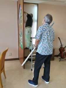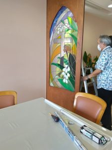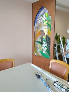 ラウンジのステンドグラスの中の蛍光灯を取り換えていました。
