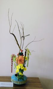 石化やなぎ、ヒペリカム、ダリア、ケイトウ、スプレー菊