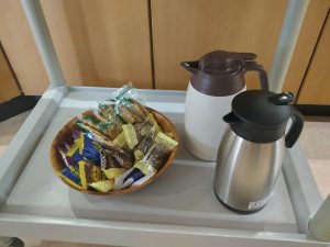 お盆のワゴン、下にはコーヒーとハーブティー。