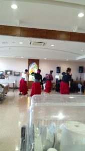 2時華やかな衣装のフラメンコが‼ オ レイッとはじまりました。真っ赤な長い裾を引きずった見事な衣装 大きなセンスを優雅に回す~患者さん楽しめたかな。