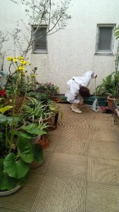 それほど汚れても乾いてもいなかったので2階は掃き掃除、3階は散水しました。カッパ着たボラさんわかります?