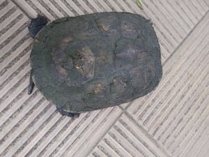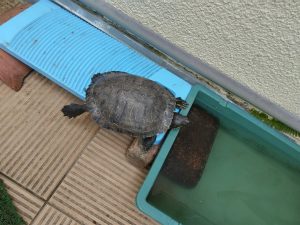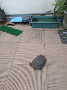 さて、中庭では、忍ちゃんが、滑ってプールに入れないかな?