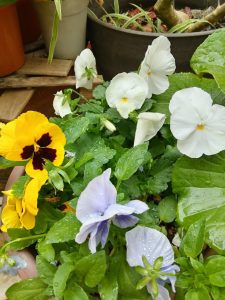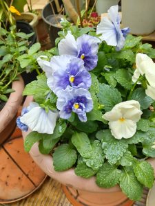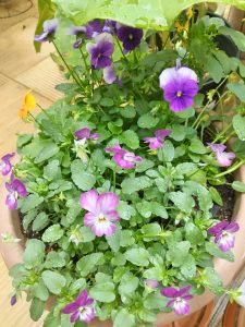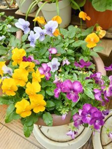 中庭では、スミレ、パンジー、ヴィオラが咲き誇っています。